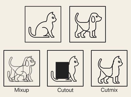 - Cutmix - randomly select a pair of input images, cut a random patch of pixels from the first image and paste it to the second image, and then mix their labels proportionally to the area of the patch.